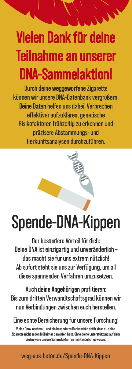 Mit unserem innovativen Spende-DNA-Kippen-Programm sammeln wir weggeworfene Zigarettenstummel ein und werten die daran haftende DNA aus. Dank moderner Technologien ist das heute einfacher denn je, und wir können die gesammelten Proben für praktische Analysen nutzen.