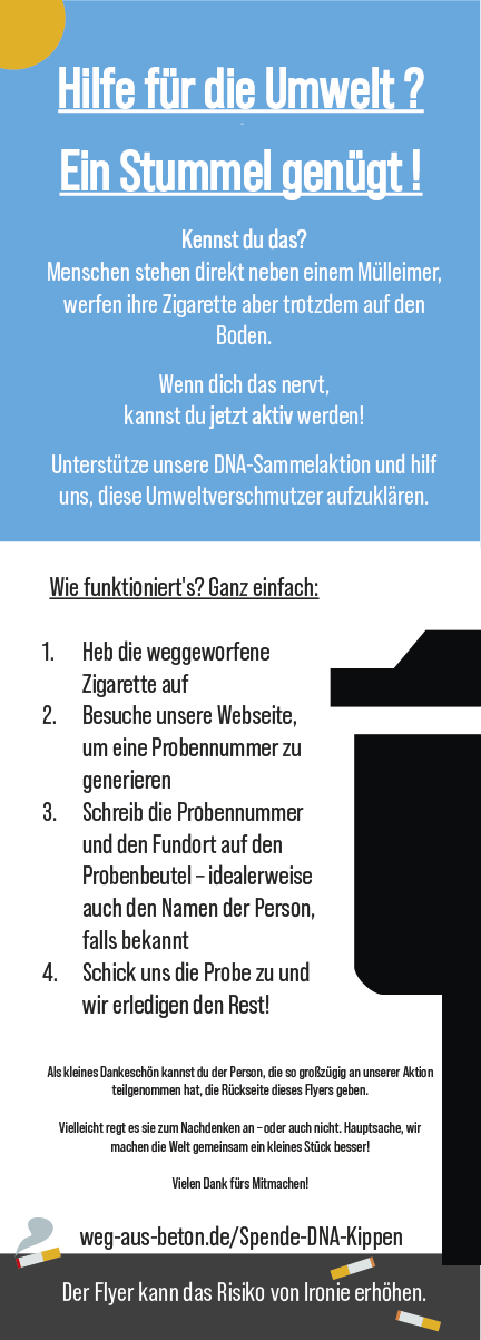 Verteilen Sie unsere Flyer und helfen Sie uns, noch mehr Kippen zu sammeln. Gemeinsam können wir eine sauberere Umwelt und eine sicherere Zukunft schaffen!